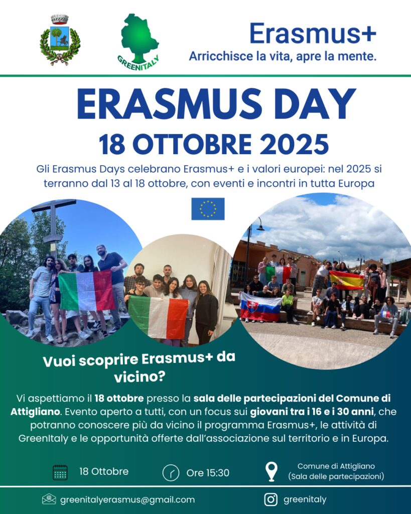 On the occasion of the 2025 Erasmus Days, celebrated all across Europe from October 13 to 18, the association GreenItaly is organizing a local event in Attigliano. The initiative will take place on October 18 at 3:30 PM in the Sala delle Partecipazioni of the Municipality of Attigliano.