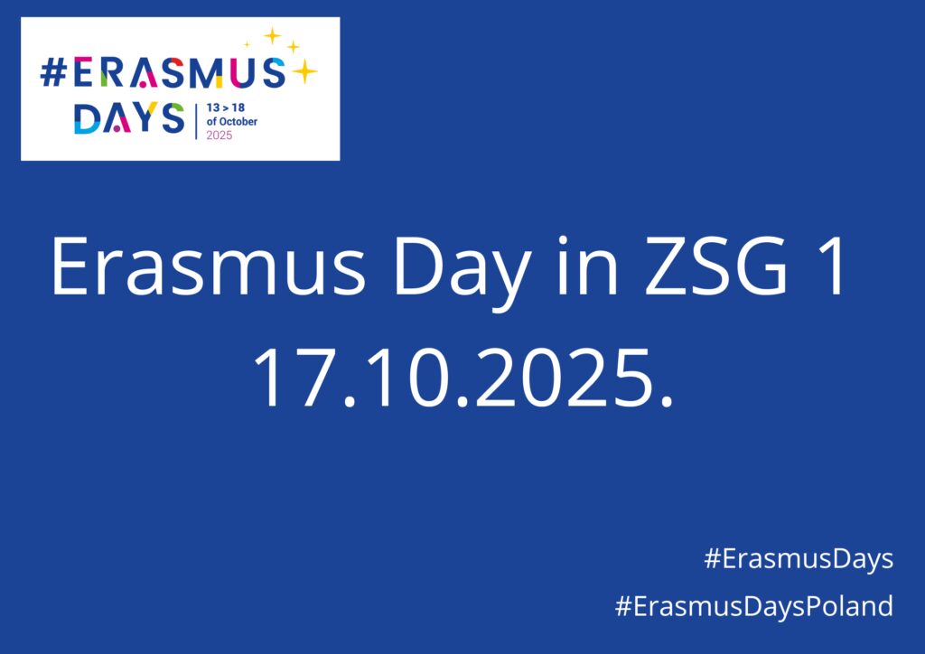 Erasmus Day in ZSG1 to wydarzenie zorganizowane dla uczniów naszej szkoły. Bedą to prezentacje i spotkania uczestników zagranicznych staży zawodowych z młodszymi kolegami, podczas których podzielą się oni zdobytym doświadczeniem, opowiedzą o korzyściach brania udziału w mobilnosciach oraz jak dzięki stażom poznali wartości przyświecające Unii Europejskiej: poszanowanie godności ludzkiej, wolność, demokracja, równość, praworządność i prawa człowieka. Podczas spotkań uczniowie dowiedzą się również jak poprzez udział w projektach Erasmus+ aktywnie uczestniczyć w kształtowaniu wspólnej europejskiej przyszłości.