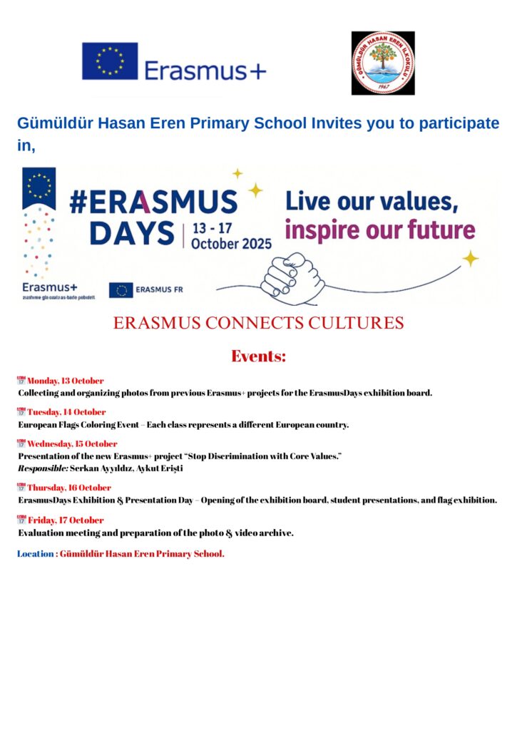 Gümüldür Hasan Eren Primary School celebrates ErasmusDays 2025 with a series of interactive and inspiring events highlighting our completed and ongoing Erasmus+ projects.