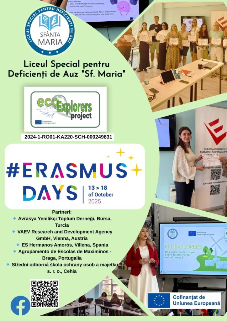 The Special High School for Students with Hearing Impairments “Sf. Maria” celebrates Erasmus Days with a series of activities focused on inclusion and diversity and on developing digital competence and literacy. The event brings together students, teachers, and educational partners through exhibitions, meetings, webinars, and presentations, aiming to promote equal access to education, responsible use of technology, and the exchange of best European practices.