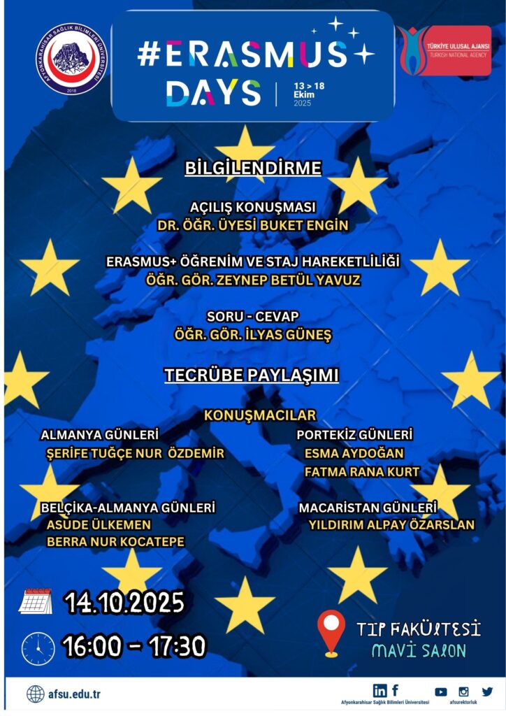 On October 14, 2025, Afyonkarahisar will host the Erasmus Days event, celebrating cross‑cultural exchange and educational mobility. The gathering offers students and faculty a platform to share experiences from Erasmus programmes and to strengthen international collaboration. Through presentations and informal conversations, participants are encouraged to build networks and foster future mobility opportunities.