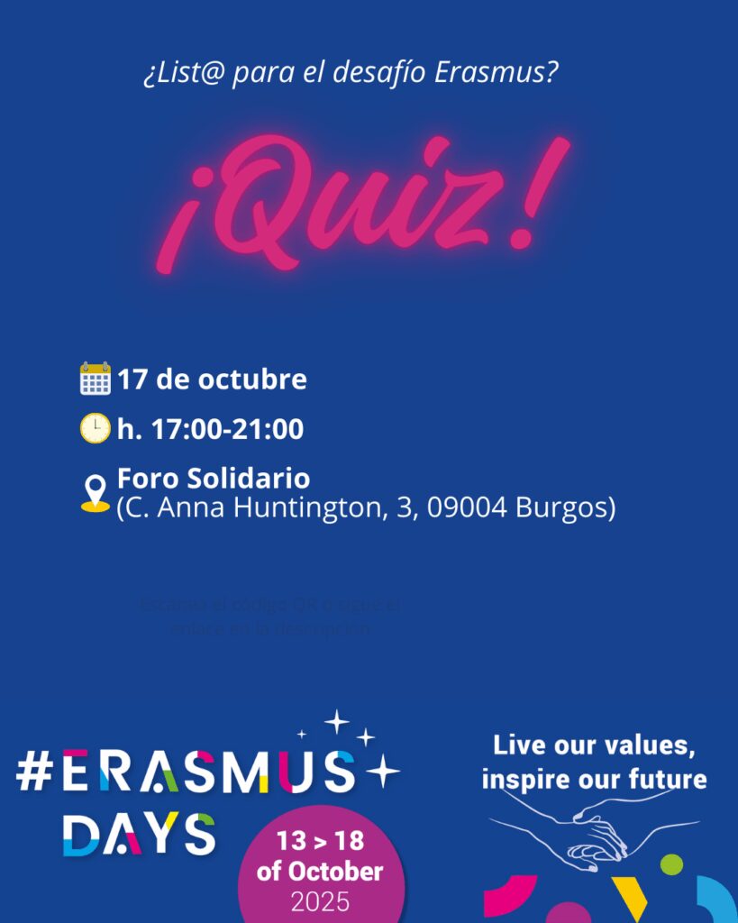 Erasmus Quiz: diferentes modalidades de concurso con preguntas sobre el programa Erasmus, la vida intercultural y datos prácticos para estudiantes. Se combinarán cuestiones útiles con contenidos curiosos y entretenidos, favoreciendo tanto el aprendizaje como la diversión en grupo.