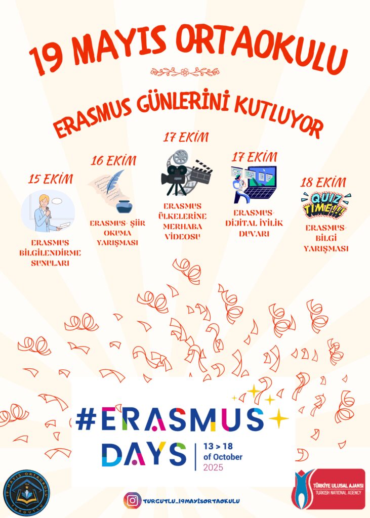 Erasmus Days kapsamında öğrencilerimizle birlikte, Erasmus+ ülkelerinin dillerinde “Merhaba” diyerek bir video kolajı hazırlayacağız. Her öğrenci farklı bir ülkenin dilinde “merhaba” diyecek, böylece Avrupa’nın kültürel çeşitliliğini, çok dilliliğini ve birlik içinde farklılık temasını yansıtacaktır. Etkinliğimizde Kültür ve Miras, Katılım ve Çeşitlilik, Vatandaşlık ve Toplumsal Katılım temaları yer alacaktır. Amaç; öğrencilerimizin farklı kültürleri tanıması, dil çeşitliliğine saygı duyması ve Erasmus+ ruhunu canlı biçimde deneyimlemesidir. Bu etkinlikle birlikte, “birlikte öğrenmek, birlikte büyümek” anlayışıyla Avrupa’nın sesini okulumuzda yankılatacağız.