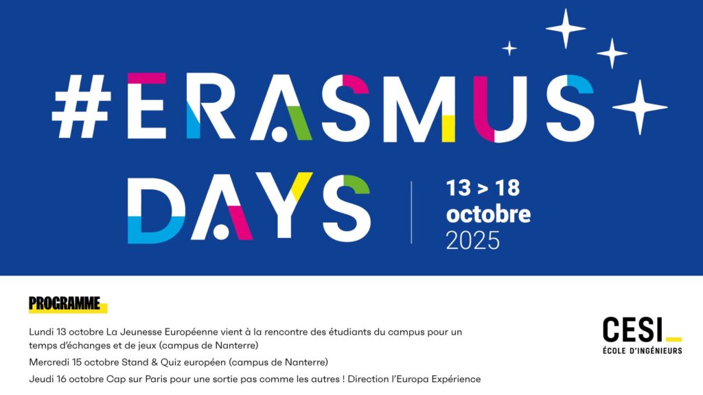 Du 13 au 17 octobre 2025, l’école d’ingénieurs CESI Nanterre vivra à l’heure européenne ! Les ErasmusDays reviennent et cette année encore, un programme original et plein d’énergie est proposé pour permettre aux étudiants de découvrir, échanger et s’immerger dans la diversité européenne.