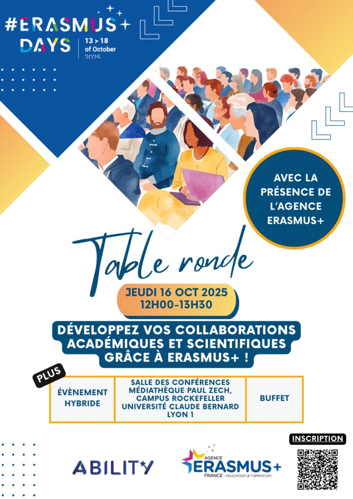 Round table for teachers and/or researchers to present the opportunities offered by Erasmus+ cooperation projects, with testimonials from three laureates. The focus will be on KA220 projects, EMJM and CBHE projects. The event, organised in hybrid format (in person or online), will close with a convivial buffet.