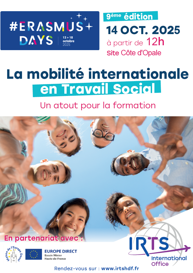 The morning will feature presentations from our partner Maison de l’Europe Douai / Europe Direct Bassin Minier Hauts-de-France and the International Relations Division of IRTS HDF, video projections to illustrate collective mobilities already carried out by former students and testimonials from IRTS’ students who have already experienced mobilities abroad.