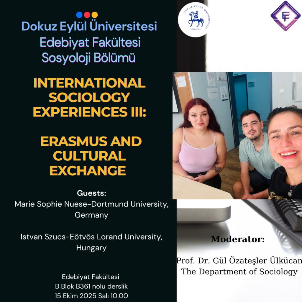 Hungary will. be sharing their experiences in Turkey, at Dokuz Eylül University and the department of Sociology. Their Erasmus experience as well as their cultural interactions and exchange will be discussed in the participation of the students and academic staff from the department of Sociology. Prof.Dr. Gül Özateşler Ülkücan from the Department of Sociology at Dokuz Eylül University will be the moderator of the event.