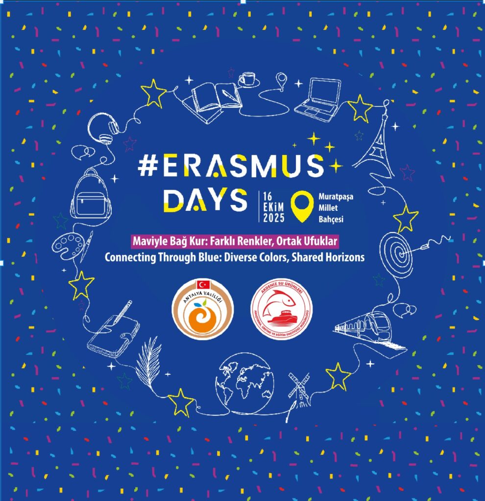 Akdeniz Su Ürünleri Araştırma Üretme ve Eğitim Enstitüsü-AKSAM (Mediterranean Fisheries Research, Production and Training Institute) will host an interactive stand at Muratpaşa Millet Bahçesi as part of Erasmus Days coordinated by the Antalya Governorship. The event will highlight the theme of connection and collaboration through maritime-inspired activities, including learning basic sailor knots. A specially designed selfie corner will invite visitors to take photos and share them using #ErasmusDays2025 and #MaviyleBağKur. The activity aims to engage people of all ages while raising awareness about Erasmus+ opportunities, AKSAM’s ongoing Erasmus+ partnerships, and other EU-funded projects. By promoting intercultural dialogue and cooperation, the event emphasizes AKSAM’s commitment to the European spirit of unity and shared horizons.