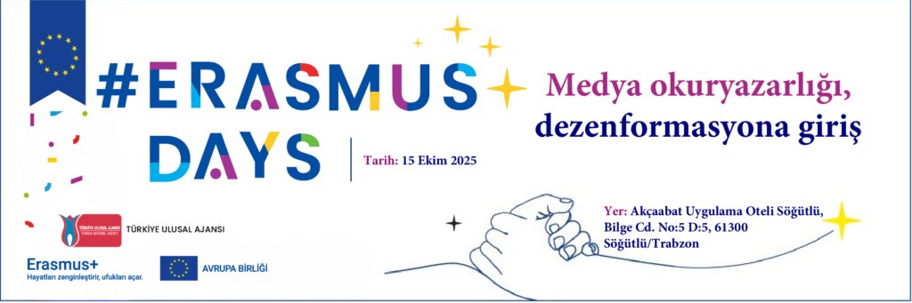 Erasmus Günleri kapsamında, Akçaabat Uygulama Oteli Toplantı Salonu’nda gençlerin aktif katılımıyla bir buluşma gerçekleştirilecektir. Etkinlik, Erasmus+ programının sunduğu fırsatların tanıtılması, gençler arasında etkileşimin artırılması ve medya okuryazarlığı alanında farkındalığın geliştirilmesi amacıyla planlanmıştır.