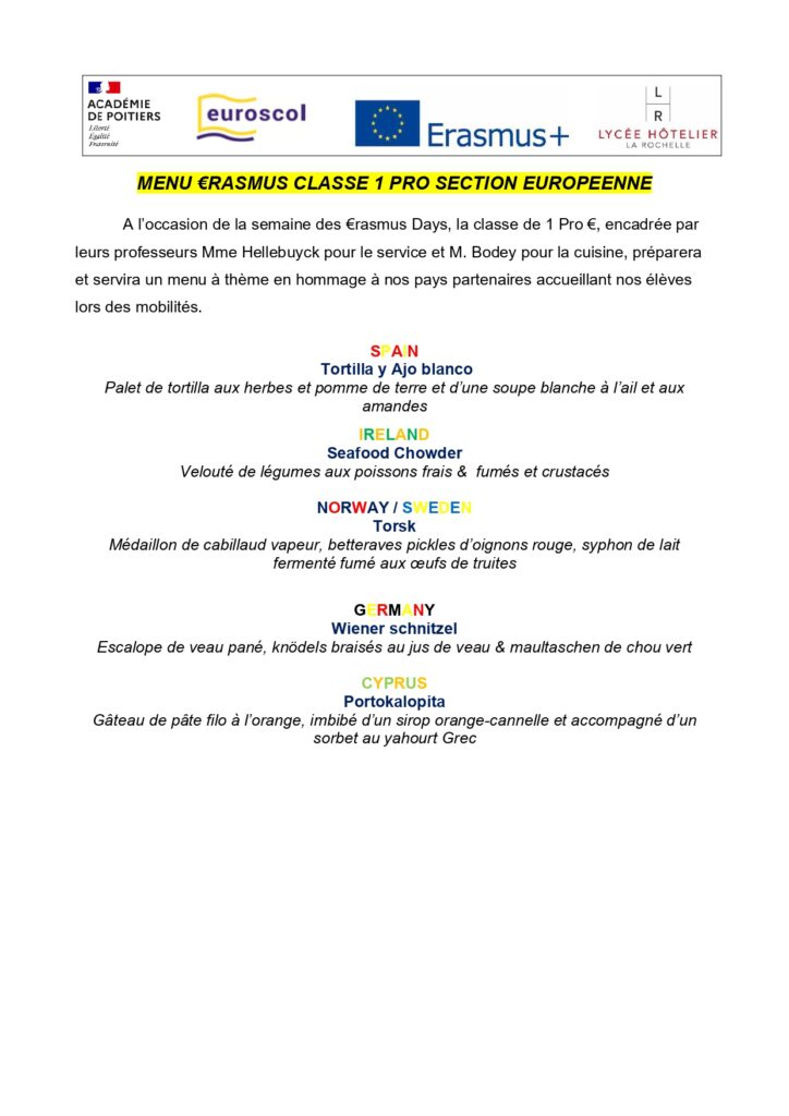 Le vendredi 17 octobre, les élèves de la classe de 1 Bac Pro section Européenne, serviront un menu en hommage à nos pays partenaires