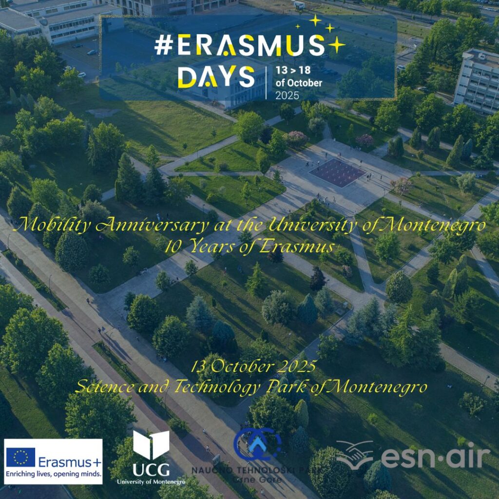 The University of Montenegro will celebrate 10 years of Erasmus+ on 13 October 2025 at 19.00 at the Science and Technology Park of Montenegro. The event will feature presentations, panel discussions with staff and students, and a special focus on the creation of ESN Podgorica, highlighting the impact of Erasmus+ on mobility, learning, and international collaboration. The evening will conclude with a networking cocktail, bringing together partners, alumni, and friends of Erasmus+.
