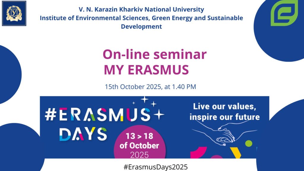 On October 15, 2025, at 1:40 p.m., the Karazin Institute of Environmental Sciences, Green Energy and Sustainable Development will host a seminar “My ERASMUS”, dedicated to ERASMUSDAYS-2025. At the seminar, students and teachers will talk about their experience participating in projects under the ERASMUS program and share their impressions of academic mobility.