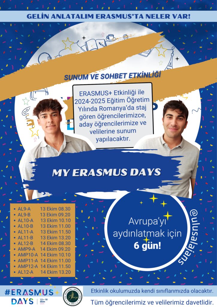 2024-2025 Eğitim Öğretim Yılında ERASMUS+ Projesiyle yurt dışında 3 aylık staj hareketliliğine katılan öğrencilerimiz Beşir ŞAHİN ve Eren US, deneyimlerini anlatacakları bir sunum etkinliği yapacaklardır. Etkinliğin amacı diğer öğrenciler ve velileri başta olmak üzere toplumu, ERASMUS Projeleri ve Ulusal Ajans ile ilgili bilgilendirmek, deneyim paylaşımında bulunmak ve projenin yaygınlaştırmasını sağlamaktır. Hedef grupları tüm seviyelerden öğrenciler ve velileri olarak belirlenmiştir. Okulumuzun sosyal medya hesaplarında ve internet sitesinde hem etkinlik öncesi davet amaçlı hem de etkinlik sonrası haberler yapılarak yaygınlaştırma faaliyetleri bir üst seviyeye taşınacaktır. Yapılan haberlere ve paylaşımların tamamına #ErasmusDays etiketi eklenecektir. Etkinlik öncesinde hazırlanacak olan selfie çerçevesi ve afişler dinleyicilere dağıtılacaktır. İlaveten, hazırlanacak olan sunumda da görsel paketten alınan materyaller kullanılacaktır. Etkinlik öncesinde yerel haber kanalı ile görüşülmüş olup, sosyal medya hesabından paylaşım yapmaları sağlanacaktır.