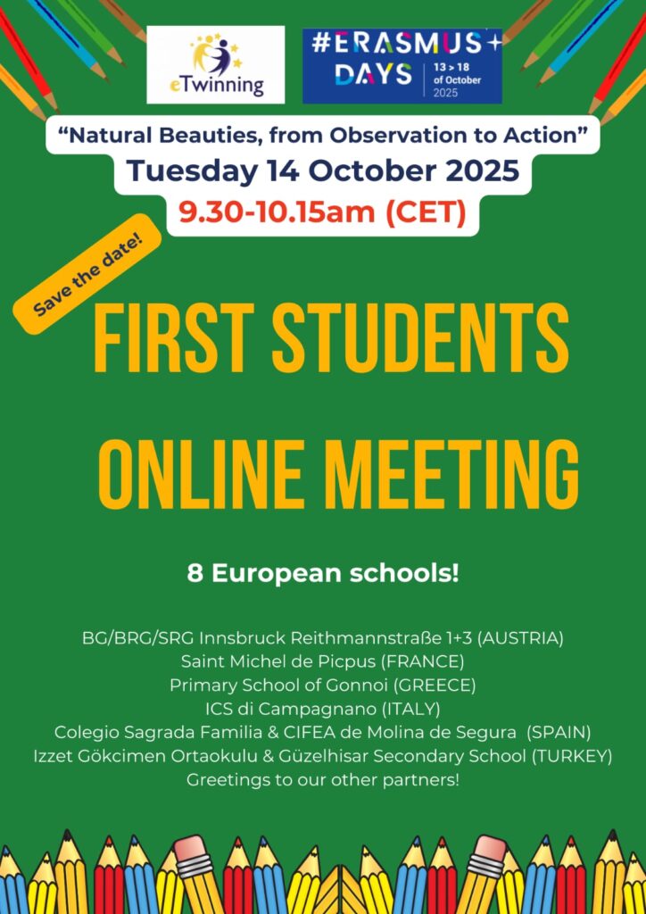 « Natural Beauties, from Observation to Action » is an international educational projet designed to increase environmental awareness and mutual understanding among students from diverse backgrounds. Students will be encouraged, not only to observe nature and focus on the natural beauties around them, but also to take action, in order to protect it. They will take two eco-challenges, collectively and individually. Moreover, by using many web 2.0 tools in the project, both students’ IT skills and English language skills as a common language will be increased. As our students will have the opportunity to get to know different cultures, this project will raise awareness about muticulturalism and diversity. Finally, running from September 2025 to January 2026, this project aimed at being in line with the United Nations’ 2030 Agenda for Sustainable Development and the 2030 EU Climate Target Plan.