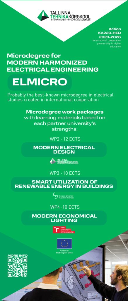 Accompanying activity: Presentation of the high education level micro degree ElMicro in “Modern harmonized electrical engineering”, funded by Erasmus +, the European Union. Developed in international collaboration: led by TTK University of Applied Sciences Tallinn, Estonia, partners Tampere University of Applied Sciences, Finland (TAMK) and Brno University of Technology, Czechia (BUT). The ElMicro work packages: Modern electrical design (led by TTK), Smart utilization of renewable energy in buildings (led by TAMK), Modern economical lighting (led by BUT).
