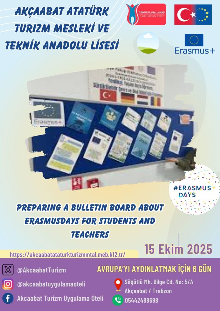 Our bulletin board highlights the meaning of ErasmusDays, past and ongoing Erasmus+ projects at our school, and the benefits of participating in such international opportunities. It also serves to inspire more students and teachers to take part in future mobility projects and embrace intercultural learning.