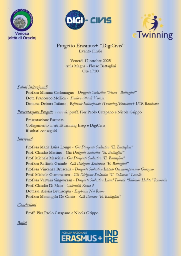 Nell’ambito degli ErasmusDays, questa Istituzione Scolastica ha calendarizzato l’evento finale del progetto Erasmus+ “DigiCivis”, che si terrà il giorno 17 ottobre 2025, presso l’Aula Magna del plesso “Battaglini”, sito in via Accademia dei Rinascenti snc, Venosa.