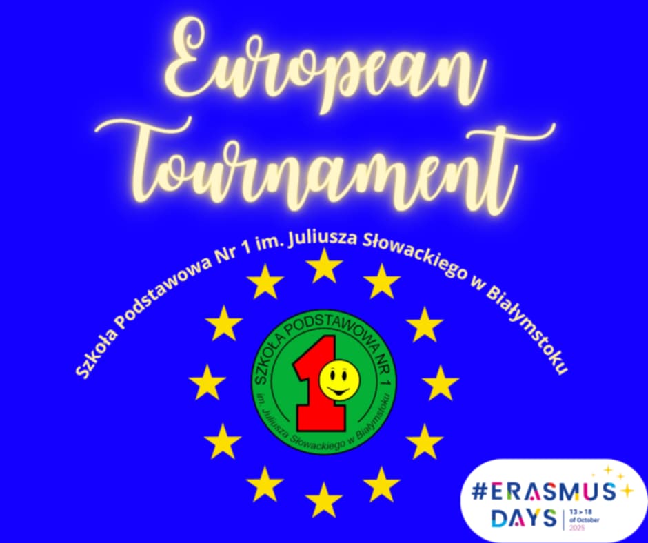 Turniej między klasami IV-VI promujący program Erasmus+: test wiedzy o UE, biegane dyktando z języka angielskiego, plakat, zawody sportowe