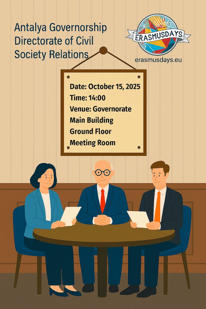 Antalya Valiliği İl Sivil Toplumla İlişkiler Müdürlüğü olarak, Erasmus+ programı kapsamında Valiliğimizin proje ekibinden Erasmus fırsatları hakkında bilgi almak amacıyla bir toplantı düzenliyoruz. Toplantımızda farklı branşlardan uzman akademisyenler yer alacak ve Erasmus+ projelerine katılım ve katkı sağlama yolları ele alınarak farkındalık yaratılacaktır.