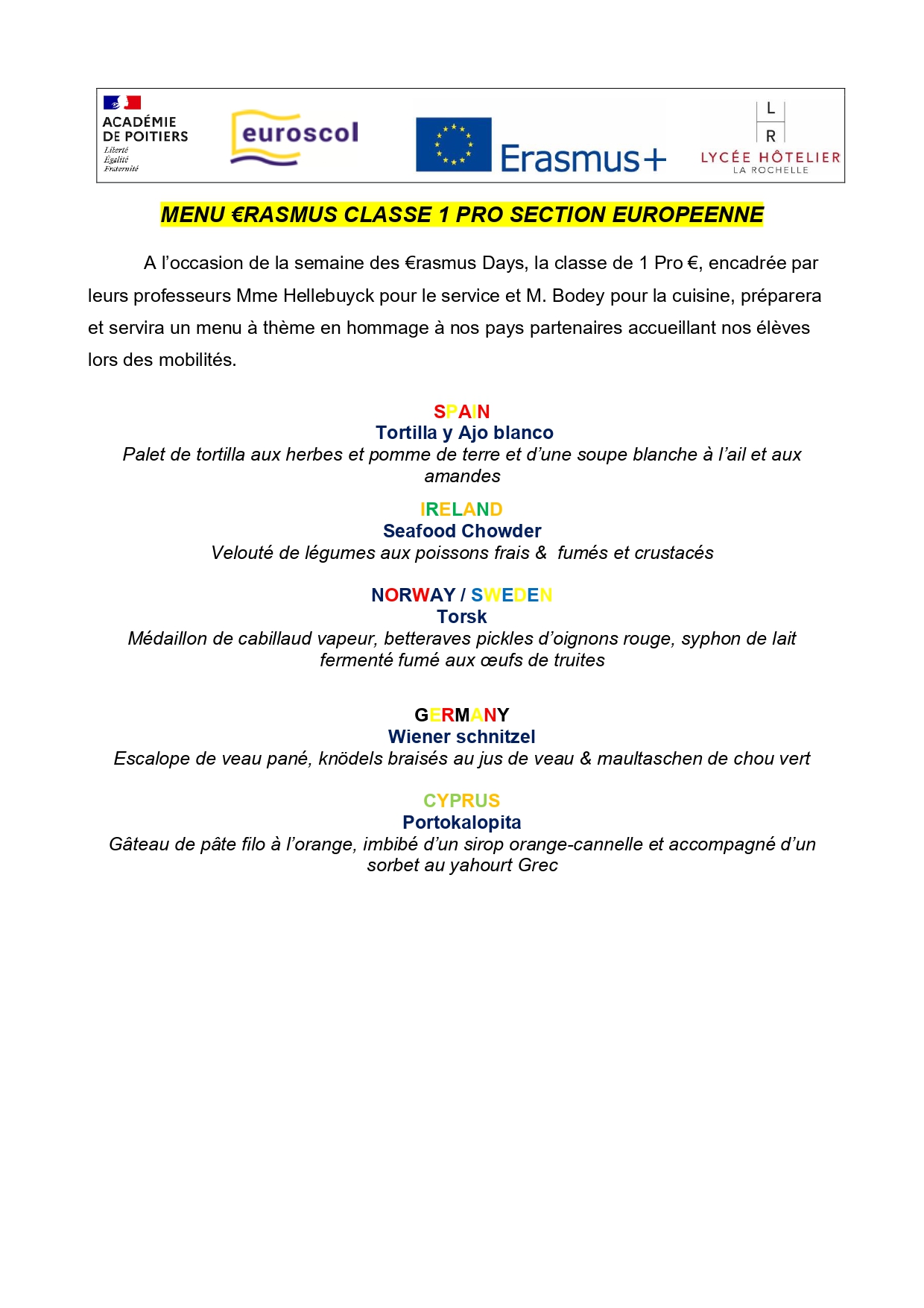 Menu €rasmus au restaurant “Vieux Carré”